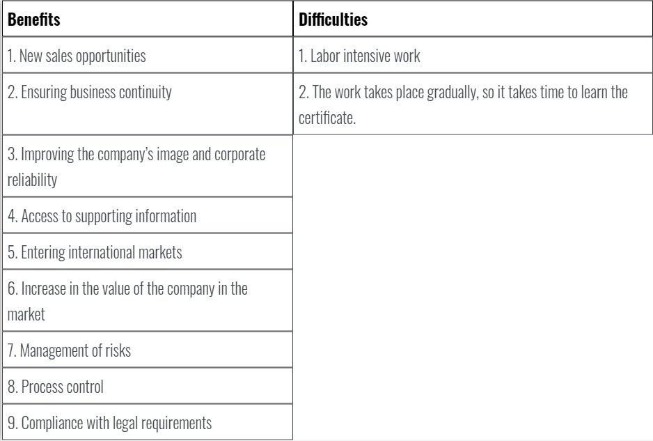 Looking at the table, we can conclude that the effort expended is worth it. Risk management, process control, etc., make it possible to continuously improve the work of the enterprise, which in turn increases both the value of the enterprise itself in the market and increases sales, compliance with legal requirements, gives the company a guarantor of trust from customers and investors., increases its image and significance in general, which makes it possible to enter international markets.